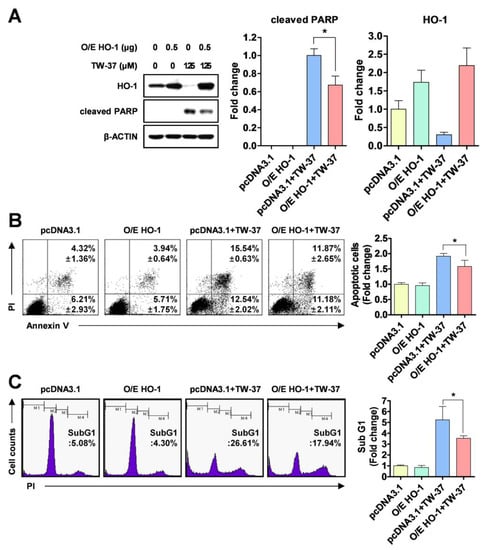 Blockade of TW-37-induced apoptosis by ectopic expression of HO-1. YD-15 cells were transiently transfected with pcDNA3.1 or pcDNA3.1-HO-1 for 6 h, and then treated with DMSO or TW-37 for 48 h. (A) Protein levels of HO-1 and cleaved PARP were analyzed by western blotting. Actin was used as a loading control. Bar graphs are expressed as mean ± SD from three independent experiments. *, p < 0.05. (B) FACS analysis of annexin V/PI staining. The annexin V-positive cells are expressed as the percentage of apoptotic cells. The results are expressed as mean ± SD from three independent experiments. *, p < 0.05. (C) FACS analysis of PI staining. The histogram represents the distribution of the cell cycle and the percentage of cells in the sub-G1 phase are expressed as mean ± SD from three independent experiments. *, p < 0.05.
