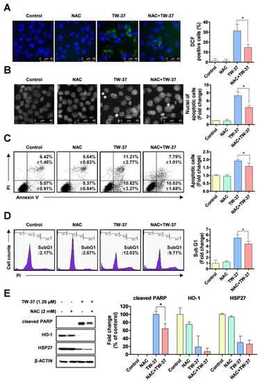 To elucidate whether the sensitive response of TW-37 to apoptosis in YD-15 cells is potentially involved in oxidative stress, we detected intracellular levels of ROS using H2DCF-DA fluorescent dye. TW-37 led to pronounced increase in intracellular ROS production, which was abolished by a ROS scavenger, N-acetyl cysteine (NAC) (Figure 4A). To confirm whether the ROS generation induced by TW-37 contributed to apoptosis in YD-15 cells, we performed fluorescence-based analysis. The typical morphological features of apoptotic cells induced by TW-37 were in part abrogated by NAC co-treatment (Figure 4B). Consistent with these results, the results of flow cytometry analysis indicated that NAC partly led to a decrease in apoptotic cells in the presence of TW-37 (Figure 4C,D). To further clarify the correlation between the two proteins (HO-1 and HSP27) and oxidative stress in TW-37-induced apoptosis, western blotting analysis was employed. Co-treatment with TW-37 and NAC in part abolished the cleavage of PARP compared with TW-37 treatment alone, but no significant changes in levels of HO-1 and HSP27 were observed (Figure 4E), suggesting that HO-1 or HSP27 influences intracellular ROS generation-mediated apoptosis. Next, we further investigated the biological role of HO-1 in oxidative stress-induced apoptosis upon TW-37 treatment. The ectopic expression of HO-1 in part decreased the intracellular ROS production induced by TW-37 (Figure S3). These results suggest that HO-1 plays an important role in oxidative stress-induced apoptosis upon TW-37 treatment, and that intracellular ROS generation is required for TW-37-induced apoptosis in YD-15 cells, which might be accompanied by regulation of HO-1 expression.