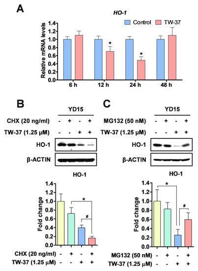 In order to clarify how HO-1 protein was reduced by TW-37, we first analyzed the expression levels of HO-1 mRNA using qPCR. TW-37 treatment decreased HO-1 mRNA levels at two time points (12 h and 24 h), whereas after reduction by TW-37 treatment for 48 h, the levels returned to the original state (Figure 5A). Previously, Lin et al. [] suggested that protein turnover was involved in the regulation of HO-1 protein expression. To address this question, the effect of TW-37 on HO-1 protein turnover in YD-15 cells was analyzed using cycloheximide (CHX), a new protein synthesis inhibitor. Co-treatment with TW-37 and CHX reduced HO-1 protein to a greater degree than did single treatment with TW-37 (Figure 5B). To investigate the relationships of proteasomes with TW-37-induced HO-1 protein degradation, we assayed the effect of the proteasome inhibitor MG132 on HO-1 and found that the decrease in HO-1 protein level by TW-37 was significantly reversed by MG132 (Figure 5C). Collectively, these results suggest that HO-1 is modulated by TW-37 through both transcriptional and post translational modifications.