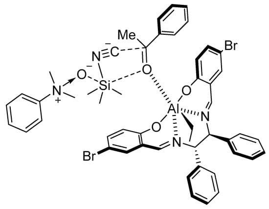 The double activation catalysis realized by Feng was able to overcome the low electrophilicity of ketones, allowing a stereoselective addition in good yields and good ees. The catalytic system consists of a chiral Al(salen) complex and an amine N-oxide. It was more active for aliphatic ketones (TON 1000) and it was applicable to a wide range of aliphatic and aromatic ketones, converting them to the corresponding cyanohydrin O-TMS ethers in excellent yields and with high enantioselectivities (94% ee for aromatic ketones, 90% ee for aliphatic ones). The authors analyzed the reaction from a mechanistic point of view, showing that the Al(salen) was playing the role of Lewis acid, coordinating the ketone thanks to the free coordination site, while the N-oxide was acting as a Lewis base, activating the TMSCN (Figure 4).