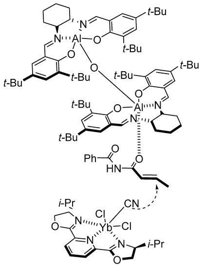 The combination of the two catalysts led to a highly reactive and enantioselective system. Mechanistic investigations carried out on the dual-catalyst system revealed a first-order dependence on both [(S,S)-(salen)Al]2O and (pybox)ytterbium (Figure 6). The chiral complex also works in matching combination, since replacing the ytterbium complex with its enantiomer led to decreased ees and conversions. Additionally, a similar active covalently-linked dinuclear [Al(salen)O]2–(PyBOX)ErCl3 complex was found relatively active in the conjugate cyanation of α,β-unsaturated imides [56].