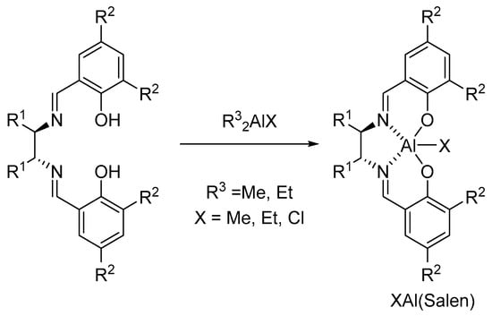 The preparation and chemistry of XAl(salen) species were reviewed by Atwood [23]. Al(salen) complexes are conveniently prepared by combining the chiral or achiral salen ligand with available solutions of trialkyl aluminum reagents in an aprotic solvent at room temperature (Scheme 1). Generally, the reaction is performed in toluene.
