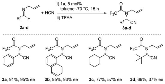 Following the chemistry of the chiral Mn-, Co- and Cr-(salen) complexes studied by Jacobsen, which were proven to promote a plethora of interesting reactions, he explored the addition of cyanide ion to imines promoted by various M(salen) complexes. This investigation revealed that many salen complexes (Ti, Cr, Mn, Co, Ru) were all able to promote the reaction. ClAl(salen) 1a was found as the best suited catalyst. Such catalyst was obtained by reacting the respective salen ligand with Et2AlCl in CH2Cl2/toluene mixture as the reaction solvent. A remarkable observation is related to the absence of strict anhydrous conditions in the reaction mixture, suggesting that the effective cyanating species was HCN, formed by the hydrolysis of the cyanide source Me3SiCN. Low temperatures were necessary to suppress the background reaction. The reaction was employed in the synthesis of a non-natural aminoacids from 2a–d. Although the mechanistic investigation was not reported in successive studies, the reaction probably occurs via a double activation process where a CNAl(salen) attacks an Al(Salen)-coordinated imine in the enantiodetermining step.