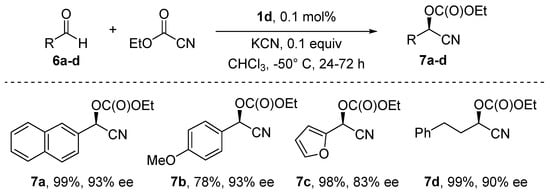 - Brodbeck, D.; Àlvarez-Barcia, S.; Meisner, J.; Broghammer, F.; Klepp, J.; Garnier, D.; Frey, W.; Johannes Kästner, J.; Peters, R. Asymmetric Carbocyanation of Aldehydes by Cooperative AlF/Onium Salt Catalysis: From Cyanoformate to KCN as Cyanide Source. Chem. Eur. J. 2019, 25, 1515–1524. [Google Scholar] [CrossRef]