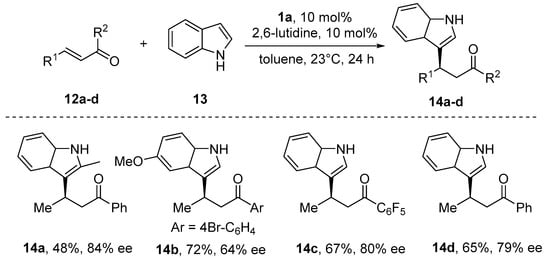 - Bandini, B.; Fagioli, M.; Garavelli, M.; Melloni, A.; Trigari, V.; Umani-Ronchi, A. Can Simple Enones Be Useful Partners for the Catalytic Stereoselective Alkylation of Indoles? J. Org. Chem. 2004, 69, 7511–7518. [Google Scholar] [CrossRef]