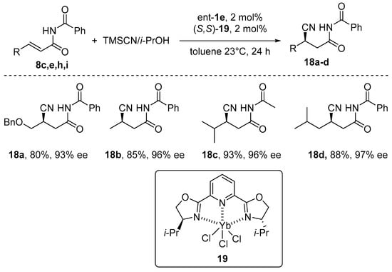 In all the described Michael-type reactions, mechanistic investigations revealed that Al(salen) complexes effectively behave as Lewis acids, capable to coordinate the unsaturated compounds, controlling the approach of the nucleophiles. However, the addition of cyanide to unsaturated amides was proven unsuccessful. Regarding the capability of Al(salen) complexes to activate unsaturated imides, Jacobsen wanted to investigate the possibility to perform a double activation process, adding a complex able to activate the nucleophilic cyanide towards the addition [55]. In order to improve the rate and scope of the reaction, the incorporation of a (pybox)YbCl3 complex (Scheme 9) was considered.