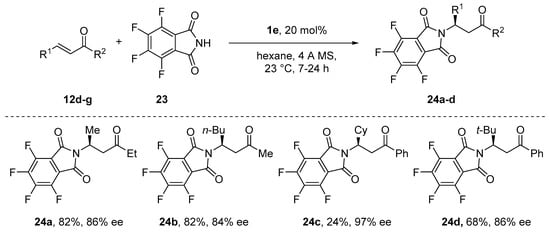 As was previously discussed, the imides showed an insufficient reactivity towards cyanides. Nevertheless, kinetic studies indicated that these polymer-supported catalysts were significantly more active than their corresponding unsupported analogues. Presumably, the catalyst is also able to play a role in activating the cyanide towards the addition. Recently, the salen μ-oxo [(S,S)-(salen)Al]2O 1e was reported to catalyze the asymmetric 1,4-addition of 3,4,5,6-tetrafluoro- phthalimide 23 to unsaturated ketones (Scheme 11) [61].