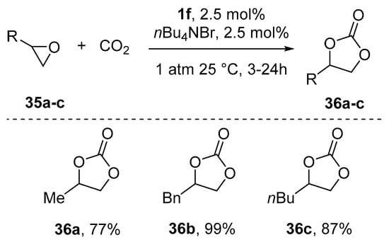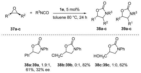The reaction proceeded with overall retention of epoxide stereochemistry, and both aromatic and aliphatic isocyanates were employed as reacting substrates. The reaction is performed in the absence of co-catalysts and the proposed mechanism considered the breaking and reforming of the Al−O−Al bridge as the reaction progressed. Finally, the reaction with carbon dioxide can be used for a practical and inexpensive methodology, the kinetic resolution [85] of terminal epoxides [86]. The reaction was carried out under mild conditions (0−25 °C and 1 bar of CO2 pressure) in the presence of tetrabutylammonium bromide as a co-catalyst and in the absence of solvent. Although the relative reaction rate of the two enantiomers of epoxide (krel) was not high and substrate-dependent, the highest krel obtained was 15.4 and it was possible to obtain moderate enantiomeric excesses for the desired product.