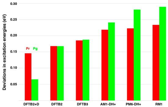 In addition, we performed optimizations with density functional tight binding (DFTB) approach [75,76]. For this family of SQM methods, DFTB2 with mio-1-1 parameters [77,78] and DFTB3 [79] with 3ob-3-1 parameters [80,81] are implemented in the AMBER software suite. For the truncated chromophore, the former method is found to yield structures that are closer to the RI-CC2 reference for both forms, see Table S4. The RMSD value of 0.79 Å for Pr is similar to the results from PM6-DH, whereas the value of 0.94 Å for Pg is already lower than in case of the Hartree-Fock based methods. Furthermore, using an empirical dispersion correction (+D) [82] in combination with DFTB2 results in further improvements: the RMSD values of 0.58 Å (Pr) and 0.23 Å (Pg) are for each form the lowest among all evaluated methods, see Table 1. However, no dispersion correction, e.g., Grimme′s dispersion correction D3 [83], is available in the current implementation of DFTB3 in the AMBER software package. Hence, we find DFTB2+D to be the most promising SQM method for the description of the PCB chromophore based on the assessment of in vacuo optimized geometries.