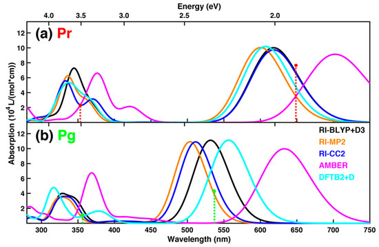 The discussion will mainly address the lowest energy absorption band, but for completeness the spectra simulated for all methods listed in Table 2 and Tables S7–S9 are given at the end of the Supplementary Materials in Figures S3–S6. In case of 10 snapshots, the lowest energy absorption band of both forms is narrower and more intense. Furthermore, the absorption maxima are shifted more towards each other. Nonetheless, a difference in absorption is 0.15 eV, see Table 2. Also the ratio of absolute absorption intensity of Pg divided by Pr remains close to 0.9 and is therefore hardly affected. Employing a larger cutoff of 24 Å for the point charges from the environment leads to a slightly smaller photoproduct tuning, but the absorption shifts are only around 0.01 eV for both forms and therefore the smaller cutoff of 12 Å appears to be sufficient. Employing a larger basis set including diffuse functions red shifts the absorption maxima of both forms to nearly the same extent, ca. 0.06 eV, leaving the photoproduct tuning virtually unchanged. The same holds for the ratio of absolute absorption intensities, where the larger basis set leads to a similar decrease for both forms.