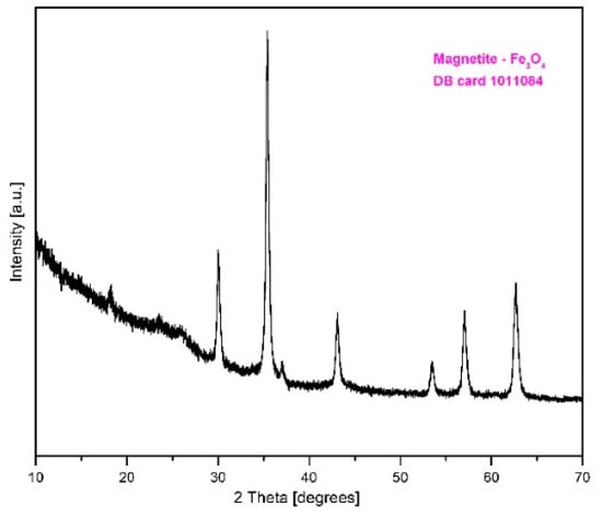 The XRD pattern (Figure 1) revealed that the analyzed sample contains only magnetite (Fe3O4) as single-phase according to the DB card 1011084; also, the active carbon is present in an amorphous phase which is not evidenced on the XRD pattern.
