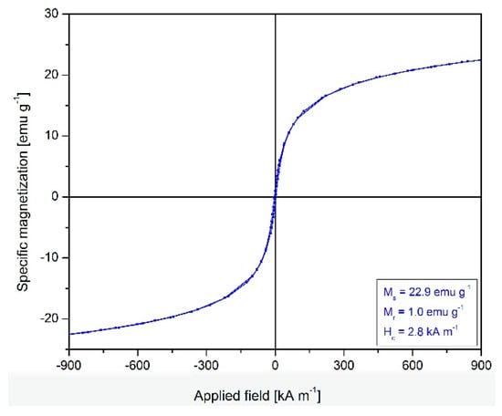 The presence of carbon in the magnetic matrix led to the decrease of the saturation magnetization (Ms = 22.9 emu·g−1) when compared to the saturation magnetization of bulk magnetite (Ms = 84 emu·g−1) []. It is well known that a high magnetization value is correlated with larger particles; this observation is congenial with our results regarding the saturation magnetization and the matrix size evaluated by transmission electron microscopy Furthermore, our results are in agreement with previously reported literature data [,].