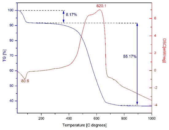Thermal analysis revealed a total mass loss of 63.34% in two stages. In the first stage, the sample loses 8.17% of the total mass, and an endothermic process can be noticed with a maximum at 80.6 °C, attributed to the water removal. The second stage is wider, located between 300 °C and 650 °C, with a maximum at 620.1 °C; within this interval the sample loses 55.17% of the total mass and shows a strong exothermic effect assigned to the oxidation of the carbon content present in the sample.