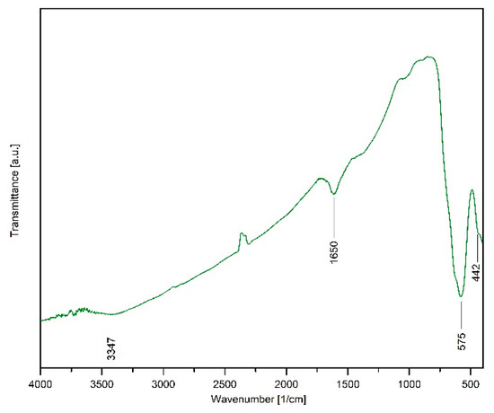 The analysis of the FTIR spectrum (Figure 4) reveals the presence of bands located at 575 cm−1 and 442 cm−1 corresponding to the stretching vibration of Fe-O from the Fe3O4@C matrix [,,]. This result is in agreement with the XRD analysis that proved magnetite to be a single phase. In addition, the FTIR spectrum shows the presence of amorphous phases that cannot be identified by X-ray diffraction. The band located at 1650 cm−1 can be attributed to the C=O stretching vibration, while the band located at 3347 cm−1 can be assigned to the O–H stretching vibration. These bands characterize the organic residue present in the sample after the raw materials combustion, in particular, the combustion fuel.
