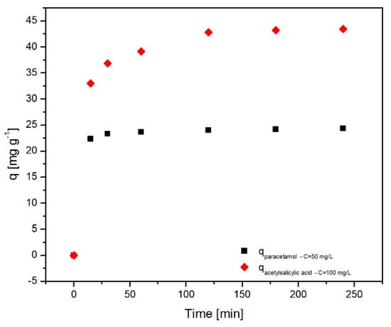 where C0—the initial concentrations of the paracetamol and acetylsalicylic acid solutions, respectively [mg/L]; Ct—the solution concentrations at time t [mg/L]; Ce—the solution concentrations at equilibrium [mg/L]; V—the volume of the aqueous solutions [L]; and mads—the adsorbent mass [g].