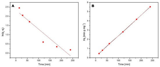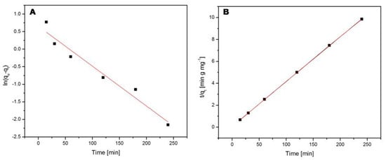 The pseudo-first-order (A) and the pseudo-second-order (B) models for paracetamol adsorption.