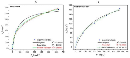 The experimental data were investigated with Langmuir (Equation (7)), Freundlich (Equation (8)), and Redlich–Peterson (Equation (11)) adsorption isotherms (Figure 11). These isotherms provide significant information concerning the surface properties of the carbon matrix and the affinities between the Fe3O4@C matrix and the adsorbed drugs (paracetamol and acetylsalicylic acid, respectively), parameters of paramount importance for the adsorption process, and its efficiency.