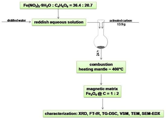 A magnetic matrix consisting of iron oxide magnetic nanoparticles (magnetite—Fe3O4) and activated carbon [] was prepared for the adsorption of the two analgesic drugs from aqueous solutions. Briefly, 36.4 g Fe(NO3)3·9H2O (Roth, Karlsruhe, Germany, 96%) and 20.7 g tartaric acid (C4H6O6) (Merck, Darmstadt, Germany, 99.5%) were dissolved in 50 mL distilled water and the resulting solution was then transferred into a round-bottom flask containing 13.9 g activated carbon. The mixture was kept for 24 h to impregnate and was afterwards placed inside a heating mantle at 400 °C so that the combustion reaction could take place (Figure 12).