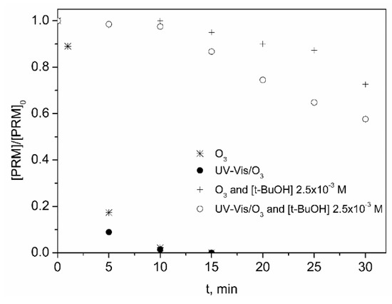 In Figure 2A the evolution with time of the normalized concentration of PRM corresponding to different oxidizing systems is shown. Also, Figure 2B depicts the variation of percentage of TOC removed with time for the same ozone-based treatments. As observed in Figure 2A, Vis radiation caused no photodegradation of PRM, whereas some photolysis occurred under UV-Vis (10% after 1 h). When ozone was fed, the degradation of PRM was fast, and total conversion was achieved in less than 20 min regardless of the presence of radiation. However, PRM elimination rate was higher under UV-Vis, the value of the apparent pseudo-first order rate constant being, kObs, 0.32 and 0.43 min−1 (R2 > 0.98), for O3 and UV-Vis/O3, respectively. In any case, this high degradation rate was unexpected considering the low reactivity of PRM towards ozone (kO3-PRM = 1.0 ± 0.1 M−1 s−1, obtained by competition kinetics [35]), and also that at the pH of the solution (pH0~6 that decreased to pH~5 after 60 min) the decomposition of O3 into HO· was not favored. Thus, the kO3-PRM value was checked using a direct absolute method [39] (see Supplementary Information). After confirming the slow regime of ozone absorption [40], kO3-PRM = 3.08 ± 0.14 M−1 s−1 was obtained, in agreement with Real et al. [35]. According to these results hydroxyl radicals most probably contribute to the removal of PRM by ozonation. To check this, some experiments of PRM ozonation ([PRM]0 5 mg L−1 = 2.3 × 10−5 M) were performed adding tert-butanol (t-BuOH, [t-BuOH]0 2.5 × 10−3 M) as HO· scavenger. At these conditions, taking into account the rate constant of the different reactions involved (kO3-PRM = 3.08 M−1 s−1; this work; kO3-tBUOH = 1.1 × 10−3 M−1 s−1 [41]; kHO·-PRM = 6.7 × 109 M−1 s−1 [35]; kHO·-tBuOH = 6.2 × 108 M−1 s−1 [42]), in case hydroxyl radicals are formed they will mainly react with the alcohol whereas O3 will react only with PRM. The influence of the presence of t-BuOH on the elimination of PRM by O3 and UV-Vis/O3 processes is shown in Figure 3.