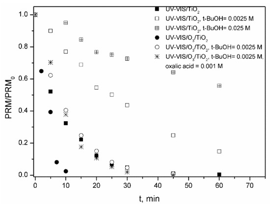 The involvement of HO radicals in bulk water on PRM degradation by TiO2 photocatalysis (in the presence and absence of ozone) was determined using t-BuOH as a HO· scavenger [35]. As shown in Figure 5, the presence of t-butanol reduced PRM removal rate, which clearly indicates an important participation of bulk water HO radicals. However, in photocatalytic oxidation processes, oxidizing holes (formed in the valence band) and electrons (from the conduction band) can also participate in the oxidation. According to the well-known TiO2 photocatalytic oxidation process, formed holes can react, directly or through adsorbed hydroxyl radicals formed from their reaction with hydroxyl groups or adsorbed water, with the adsorbed matter. In this work, however, PRM was not adsorbed on the catalyst so that hole contribution could be neglected [48]. In any case, some experiments of photocatalytic ozonation were carried out in the presence of oxalic acid, as hole scavenger [49]. As shown in Figure 5, PRM removal rate was independent on the presence or absence of this scavenger which supports the previous conclusion. Note, however, that in the absence of ozone, oxalic acid was not used because, as Andreozzi et al. reported [50], this acid also reacts with HO radicals to form the ·COOH radical: