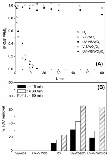 As observed in Figure 6A, removal of PRM was fast and took place at a similar rate for all the ozone-based processes. In absence of ozone (photocatalytic oxidation), unlike TiO2, PRM was not degraded regardless of the type of radiation used. These results are directly related to the redox potential of the WO3 conduction band, more positive than that of oxygen [16,17]. This implies that oxygen has not enough oxidizing power to trap the electrons jumped to WO3 conduction band so the generation of HO· does not take place. Contrary to oxygen, ozone has a more positive redox potential than WO3 conduction band and can act as electron trapping agent [20,21], which explains the behavior of the different systems in terms of TOC mineralization shown in Figure 6B. According to this figure, after 15 min the amount of TOC removed by O3, VIS/WO3/O3, and UV-VIS/WO3/O3 was ~10, 30, and 20%, respectively. Therefore, some positive effect of the presence of WO3 is deduced. The initial TOC conversion rate resulted to be higher when Vis instead of UV-VIS radiation was used which is related to the effect of the type of radiation on O3 photodecomposition, discussed in Section 2.1.1. Thus, under UV-VIS radiation, dissolved ozone photolyzes (Reactions (2)–(3)) and its concentration in water, together with its electron trapping role, diminishes.