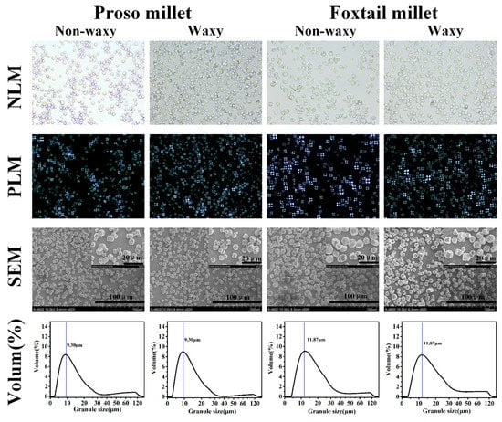 Millets, a group of small-seeded grains, are one of the oldest cereals that appeared 10,000 years ago, earlier than wheat and rice. The most widely cultivated millets are foxtail millet, proso millet, pearl millet, finger millet, and kodo millet [1]. In China, the proso (Panicum miliaceum L.) [2] and foxtail millets (Setaria italica) [3] are widely cultivated because they both have excellent drought tolerance. The shelled proso and foxtail millets are called “Huangmi” and “Minor millet”, respectively. They are preferred by many consumers due to their high nutritional value [4]. Therefore, research about proso and foxtail millets is particularly important. Starch, which can be divided into amylose and amylopectin, is one of the most important components of millet grains [1]. According to the content of amylose, millet can be divided into non-waxy (high amylose content) and waxy (low amylose content). Some studies have indicated that non-waxy and waxy millets have significant differences in physicochemical characteristics and cooking edibility [4]. Although starch is the main factor contributing to these differences, few studies have compared the starches in non-waxy and waxy millets.