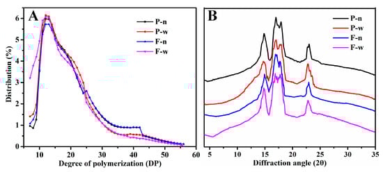 The amylopectin chain length distribution of starches notably influenced the crystalline structure, gel characteristics, and pasting properties of starches [16]. The branch chain length distribution of amylopectin is presented in Table 3 and Figure 3A. Amylopectin branch chains are generally classified into the following types according to their degree of polymerization (DP): B1 chain, B2 chain, and B3+chains. The average chain length of amylopectin in non-waxy proso (20.1) and foxtail millets (20.2) was higher than that of waxy proso (19.2) and foxtail millets (17.9). Compared with non-waxy proso millet, waxy proso millet had higher proportions of DP 6–12 and DP 13–24 but a lower amount of DP 25–37 and DP ≥37. In addition, waxy proso millet had higher proportions of DP 6–12, whereas non-waxy proso millet had higher proportions of DP 25–37 and DP ≥37. This result indicated that the proso and foxtail millets with high amylose had higher proportion of short branch chains and lower proportion of long branch chains, which was agreement with the studies in rice and maize [17].