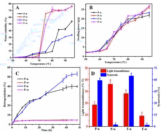 Physical properties of starches. (A), Water solubility of starch; (B), swelling power of starch; (C), retrogradation of starch; (D), light transmittance and freeze–thaw stability of starch.