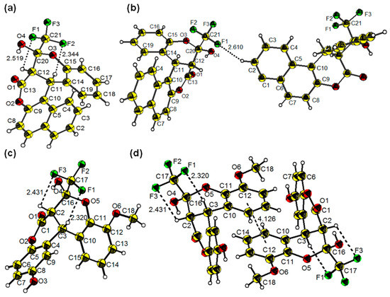 By cooling the solutions of 3a and 3n in ethyl acetate, single crystals suitable for X-ray crystallographic analysis were obtained, and their crystal structures are shown in Figure 1. Compound 3a has a twisted conformation. Its benzene ring and naphthalene ring are connected by the sp3 carbon atom of C11 with a C10–C11–C14 angle of 115.01(16)°, and a dihedral angle of 72.776° between the benzene ring and the naphthalene ring is observed. Interestingly, the rotation of the chiral carbon atoms of C11 and C12 are restricted by intramolecular hydrogen bonding between H on C12 and C11 and F in trifluoromethyl groups, with CH···F distances of 2.519 and 2.344 Å, respectively. Moreover, the adjacent molecules are connected by intermolecular hydrogen bonding with a distance of 2.610 Å, which is almost equal to the van der Waals radius (2.6 Å) [28]. In comparison to 3a, 3n also has a twisted conformation. However, two benzene rings are almost perpendicular to each other with a dihedral angle of 89.045°, and the C4–C3–C10 angle of 113.38(16)° is slightly narrowed in comparison to that in 3a. In addition, 3n shows weak intermolecular interactions with a centroid distance of 4.126 Å between adjacent methoxy-substituted benzene rings (Figure 1d). Both compounds 3a and 3n exhibit three chiral carbon atoms, C11, C12, and C21 and C2, C3, and C16, respectively. The refinement information of compounds 3a (C21H13F3O4) and 3n (C18H13F3O6) is summarized in the Supplementary Materials.