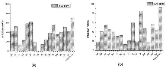The antifungal activities of the target compounds 3a–p were evaluated against Fusarium graminearum and Fusarium monitiforme by the mycelial growth rate method [29] at 500 µg/mL, using triazolone (100 µg/mL) as the positive control. The results of the antifungal activities were shown in Figure 3.