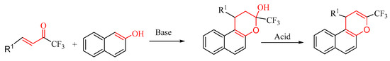 Fan et al. reported a tandem reaction of α,β-unsaturated trifluoromethyl ketones with 2-naphthol to obtain the corresponding benzo[f]chromene derivatives in the presence of catalysts with a one-pot reaction (Scheme 1) [25]. According to the literature, an 1,4-addition reaction should take place between α,β-unsaturated trifluoromethyl ketones and 2-naphthols under the catalysis of a weak base.