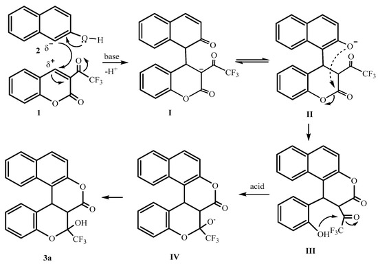 Scheme 4 shows plausible pathways for the reaction. First, the 1,4-nucleophilic addition of 2-naphthol (2) to 3-trifluoroacetyl coumarin 1 with an α,β-unsaturated ketone structure generates the carbon anion intermediate I. It then forms enolate anion II by H-transformation. Intermediate II is next transformed into a new coumarin with phenoxy anion III through nucleophilic attack by a naphthalenyl oxyanion at the initial ester group of coumarin with slightly stronger basicity as the driving force. The subsequent addition of a phenoxy anion to the electrophilic carbon of -COCF3 group happened to furnish annulation product IV, forming the final title compound 3a with a semiacetal structure after acidification.