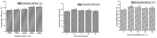 The emulsifying time was within the range of 5–25 min. The encapsulation efficiency was between 72.3 ± 1.25 and 78.91 ± 5.26%. It is helpful to improve the encapsulation efficiency of the loaded substance, but the effect of the emulsifying time on the encapsulation efficiency was limited when the initial emulsification time increased. Using 10 min as the optimal initial emulsification time, at this point, the encapsulation efficiency was 78.91 ± 5.26%.