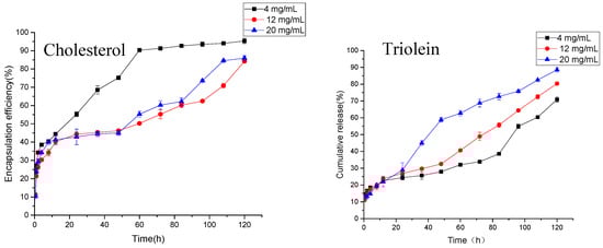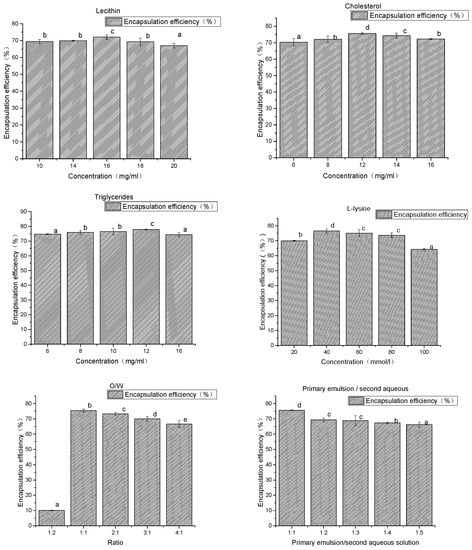 When the concentration of triglycerides increased from 6 to 12 mg/mL, encapsulation efficiency increased slightly. There was little effect on the encapsulation efficiency of liposomes when the concentration of triglycerides changed within the range of 6–16 mg/mL.