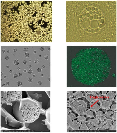 Figure 3 shows the morphology of AP-MVLs with an optical microscope, from which we can see that the MVLs were spherical with multiple non-concentric lipid vesicles inside. The opaque parts were the lipid membrane, while the transparent parts were the aqueous rooms.