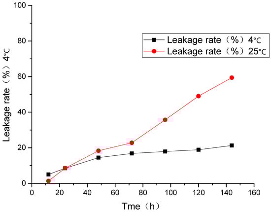 At room temperature and 4 °C, the leakage rate for 144 h was 21.3 and 59.4%, respectively, and the liposomal drug leakage happened under the two conditions above. As shown in Figure 4, when the liposomes were stored at 4 °C, the leakage rates of liposomes were relatively low, and its tendency to increase with time is slow.