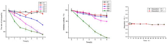 Peptides have the characteristics of degradation at high temperature, which seriously restrict the application of polypeptide drugs and health products, and bring difficulties for the production, transportation and storage of peptides [23]. The effects of temperature conditions at 4, 10, 20, 30, and 60 °C on the content and inhibitory activity of polypeptides were investigated in this paper, which provided a theoretical basis for the industrial application of peptides.
