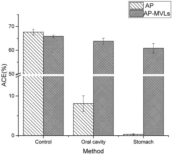 Simultaneously, the ACE inhibitory activity of peanut peptide multivesicular liposomes decreased only 2.84% after oral administration, and the ACE inhibitory activity decreased by 5.03% after passing through the stomach. It is evident that the multivesicular liposomes still have a high ACE inhibitory activity after passing through the mimic digestive system, which fully shows that the multivesicular liposomes have fully protected the structural integrity of the peanut peptide.