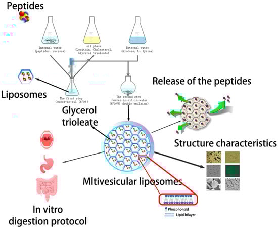 The objectives of this investigation were to assess (1) the ACE-inhibitory activity of enzymatic hydrolysates obtained from the by-product of peanut meal, (2) the multivesicular liposome formulations for the sustained delivery of peanut peptides: preparation, and (3) their characterization (Scheme 1).