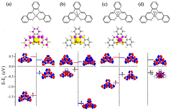 Schematic view of molecular geometric structure (top panel), spin density (middle panel), and the energy levels and the spatial distribution of the HOMO and LUMO (bottom panel). Here, (a) free Mn-salophen molecule, (b–d) Mn-salophen molecule with F, CO, and NO adsorptions. The short-dotted horizontal lines stand for the Fermi level, which is defined as the center place of the HOMO-LUMO gap of the spin-up or spin-down channel.