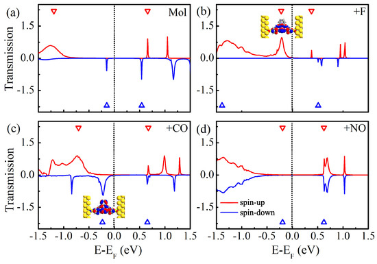 (a) The zero-bias spin-resolved transmission spectra of Mn-salophen molecular junction without chemical adsorption, (b–d) for Mn-salophen molecular junctions with F, CO, and NO adsorptions. Here, the short-dotted vertical lines stand for the Fermi level for clarity, while the red and blue lines stand for the spin-up and spin-down electrons, respectively, while the inserts in (b,c) stands for the spatial distribution of the perturbed HOMO of the spin-up and spin-down electrons.