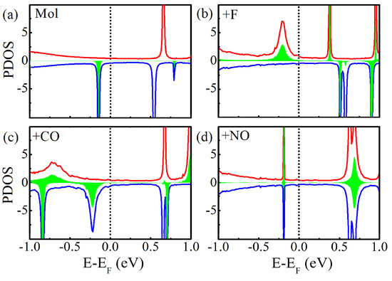 (a) The projected DOS of Mn-salophen molecule in junction without chemical adsorption, (b–d) for Mn-salophen with F, CO, and NO adsorptions. Here, the short-dotted vertical lines stand for the Fermi level for clarity, while the red and blue lines stand for the spin-up and spin-down electrons, respectively, and the PDOS of Mn cation is plotted with the filled regions with green color.