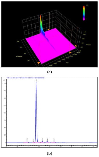 Amounts of 20 μL of solution were injected into the liquid chromatographic system. The chromatograms are recorded in Figure 14. The calculated correction factor was 1.09, while the percentage of degraded impurities was 93.2%, measured by the area normalization method (Table 3). As the degraded impurities produced by the preparation were of a small mass and oily substance, their purity and weighing errors were relatively large, and the results of the correction factor could be used as a reference [,,].