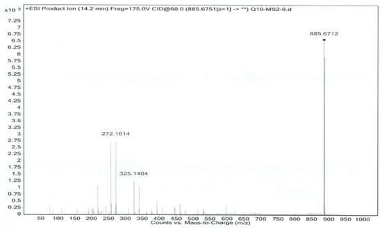 Co-Q10 reference solution and impurity X solution were precisely measured, then mass spectrometry (MS) was performed according to the chromatographic conditions above [,]. The MS and MS/MS (tandem mass spectrometry) of Co-Q10 reference substance are shown in Figure 4 and Figure 5. The same MS and MS/MS images of impurity X are presented in Figure 6 and Figure 7, respectively.