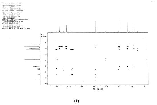 (a) H-NMR spectrum of impurity X; (b) C-NMR spectrum of impurity X; (c) DEPT spectrum of impurity X; (d) gCOSY spectrum of impurity X; (e) gHSQC spectrum of impurity X; (f) gHMBC spectrum of impurity X.