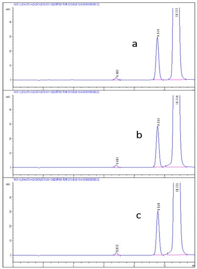 The system suitability spectrum obtained after 4 h at different concentrations of 30% hydrogen peroxide (a 2 μL; b 5 μL; c 10 μL).