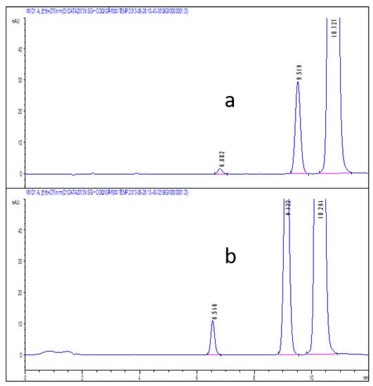 The column robustness was investigated and results showed that the peak of impurity X cannot be captured by a Hypersil SiO2 column (250 × 4.6 mm, 5 μm). Therefore, the column type used for the quality of Co-Q10 soft capsules should be stipulated as an Agilent RX-SIL column (250 × 4.6 mm, 5 μm), with the specific spectrum shown in Figure 15 [].