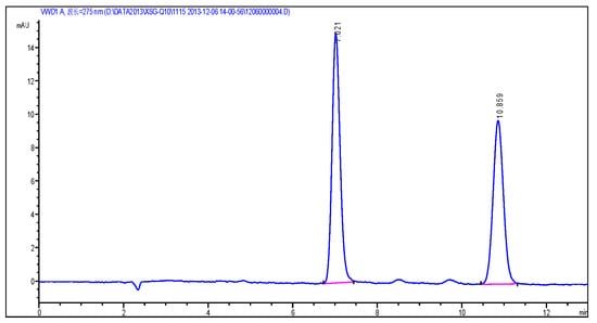 The determination was carried out on an Agilent RX-SIL column (250 × 4.6 mm, 5 μm). The column temperature was kept at 25 °C. The isocratic mobile phase consisted of N-Hexane and ethyl acetate (97:3), and the flow rate was 2.0 mL/min. The detection wavelength was set at 275 nm [,].