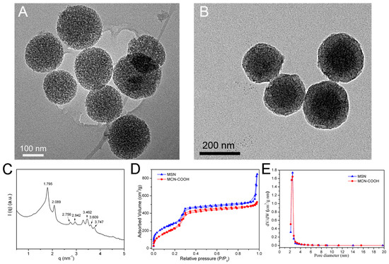 Transmission electron microscope (TEM) image of (A) MSN and (B) MCN-COOH; (C) small angle X-ray scattering (SAXS) pattern of MSN; (D) Nitrogen adsorption/desorption isotherms and (E) pore size distributions of MSN and MCN-COOH.