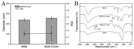 The particle sizes and corresponding zeta potentials of MSN and MCN–COOH were also measured as shown in Figure 3A. The particle size of MSN was 240 nm with a polydispersity index (PDI) of 0.129, which was larger than that of the TEM result. The size of the nanoparticles observed by TEM was in the dried condition without the hydration layer, while, the hydrodynamic diameter of the sample characterized by dynamic light scattering (DLS) was in water condition. MCN–COOH had a similar particle size to MSN of 258 nm. Furthermore, the corresponding zeta potentials of MCN–COOH and MSN were –21.5 mV and –33.8 mV and were attributed to the silanol groups in MSN and the carboxyl groups in MCN–COOH. A comparison of the Fourier transform–infrared (FT–IR) spectra of MCN, MCN–COOH, MSN–CTAB, and MSN are shown in Figure 3B. Compared with MCN, the appearance of a characteristic C=O absorption band at 1715 cm–1 for MCN–COOH indicated that carboxyl groups had been introduced in MCN–COOH. The peaks around 2852 and 2922 cm−1 were owing to the vibration of –CH2 belonging to the CTAB surfactant, and the –CH2 vibration peaks disappeared after the removal of the surfactant by calcination.